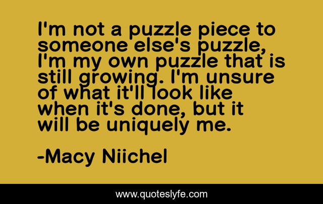 This page presents the quote "I'm not a puzzle piece to someone else's puzzle, I'm my own puzzle that is still growing. I'm unsure of what it'll look like when it's done, but it will be uniquely me.". Author of this quote is Macy Niichel. This quote is about puzzles, life, happiness,.