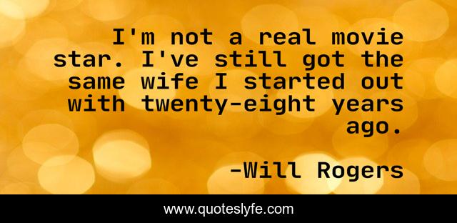 This page presents the quote "I'm not a real movie star. I've still got the same wife I started out with twenty-eight years ago.". Author of this quote is Will Rogers. This quote is about real, wife, years,.