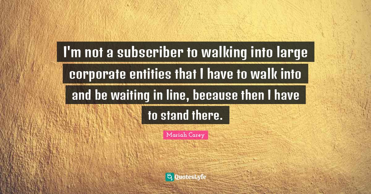 This page presents the quote "I'm not a subscriber to walking into large corporate entities that I have to walk into and be waiting in line, because then I have to stand there.". Author of this quote is Mariah Carey. This quote is about corporate, entity, walking, waiting in line, lines,.
