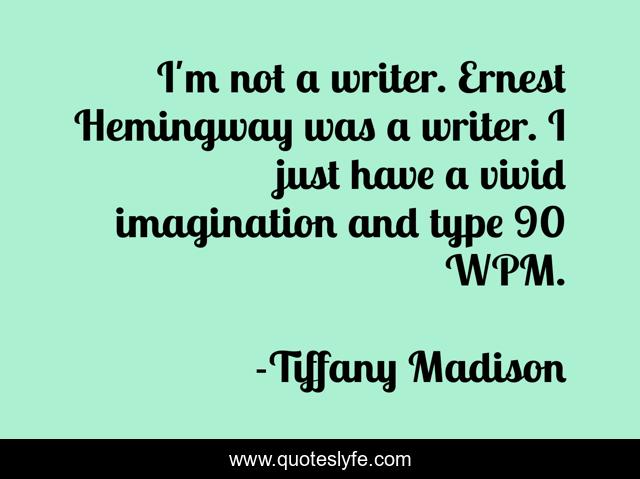 This page presents the quote "I'm not a writer. Ernest Hemingway was a writer. I just have a vivid imagination and type 90 WPM.". Author of this quote is Tiffany Madison. This quote is about writing, writing-philosophy, ernest-hemingway, writing-craft, writing-process,.