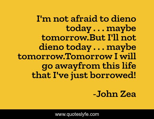 This page presents the quote "I'm not afraid to dieno today . . . maybe tomorrow.But I'll not dieno today . . . maybe tomorrow.Tomorrow I will go awayfrom this life that I've just borrowed!". Author of this quote is John Zea. This quote is about life, pain, sorrow, fighting-spirit, grief, sadness, coldness, happiness, crying,.