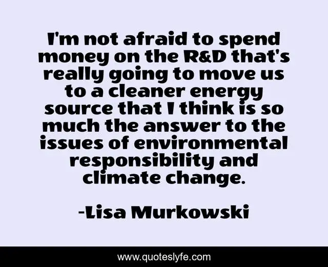 This page presents the quote "I'm not afraid to spend money on the R&D that's really going to move us to a cleaner energy source that I think is so much the answer to the issues of environmental responsibility and climate change.". Author of this quote is Lisa Murkowski. This quote is about money, change,.