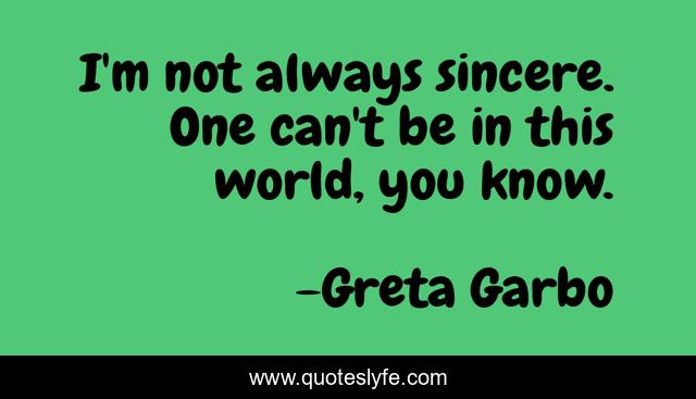 This page presents the quote "I'm not always sincere. One can't be in this world, you know.". Author of this quote is Greta Garbo. This quote is about camille, world, life, sincerity,.