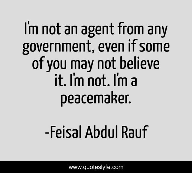 This page presents the quote "I'm not an agent from any government, even if some of you may not believe it. I'm not. I'm a peacemaker.". Author of this quote is Feisal Abdul Rauf. This quote is about may, believe,.