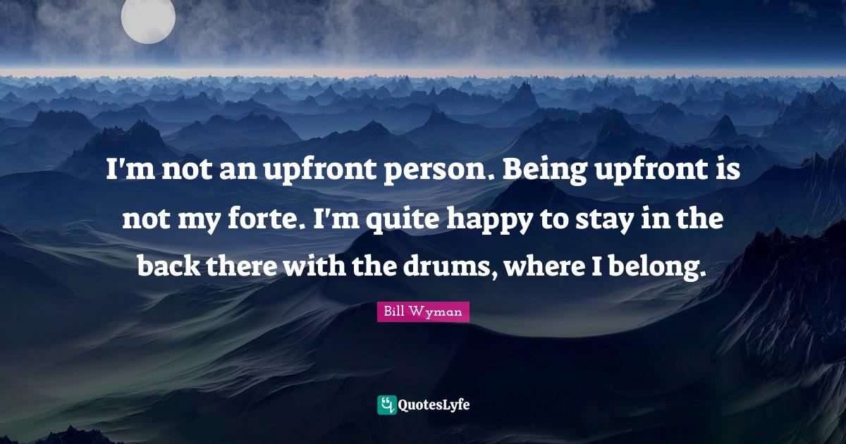 This page presents the quote "I'm not an upfront person. Being upfront is not my forte. I'm quite happy to stay in the back there with the drums, where I belong.". Author of this quote is Bill Wyman. This quote is about forte, happy, persons,.