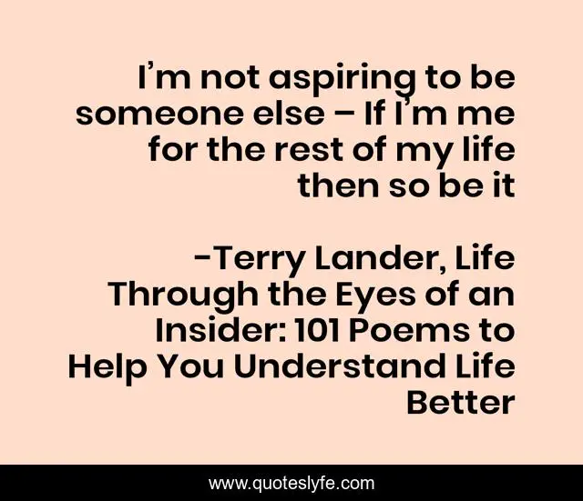 This page presents the quote "I’m not aspiring to be someone else – If I’m me for the rest of my life then so be it". Author of this quote is Terry Lander, Life Through the Eyes of an Insider: 101 Poems to Help You Understand Life Better. This quote is about funny, life, humour, aspiration, poetry, comedy, inspiration,.