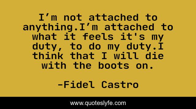 This page presents the quote "I’m not attached to anything.I’m attached to what it feels it's my duty, to do my duty.I think that I will die with the boots on.". Author of this quote is Fidel Castro. This quote is about politics, power,.