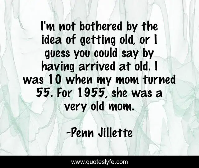 This page presents the quote "I'm not bothered by the idea of getting old, or I guess you could say by having arrived at old. I was 10 when my mom turned 55. For 1955, she was a very old mom.". Author of this quote is Penn Jillette. This quote is about getting old, she,.