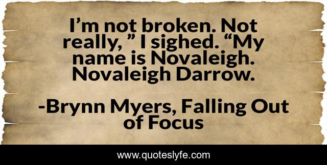 This page presents the quote "I’m not broken. Not really, ” I sighed. “My name is Novaleigh. Novaleigh Darrow.". Author of this quote is Brynn Myers, Falling Out of Focus. This quote is about self-discovery, scotland, romance, fantasy, otters, alice-in-wonderland, fae,.