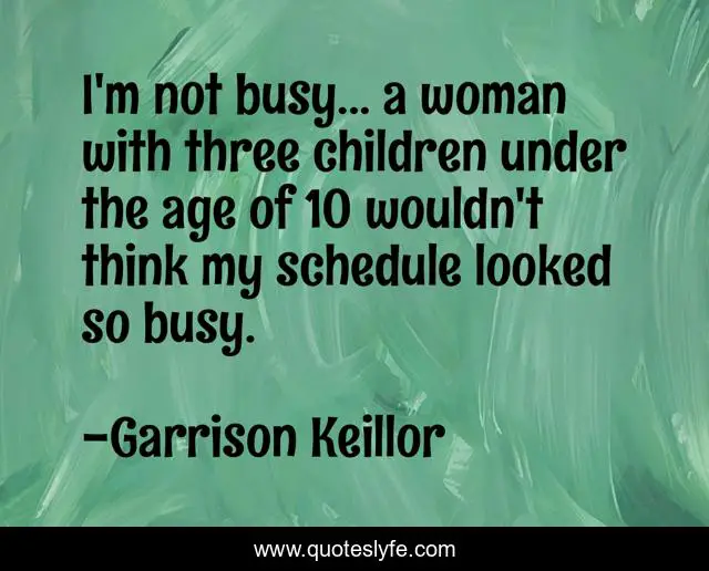 This page presents the quote "I'm not busy... a woman with three children under the age of 10 wouldn't think my schedule looked so busy.". Author of this quote is Garrison Keillor. This quote is about woman, busy, children,.