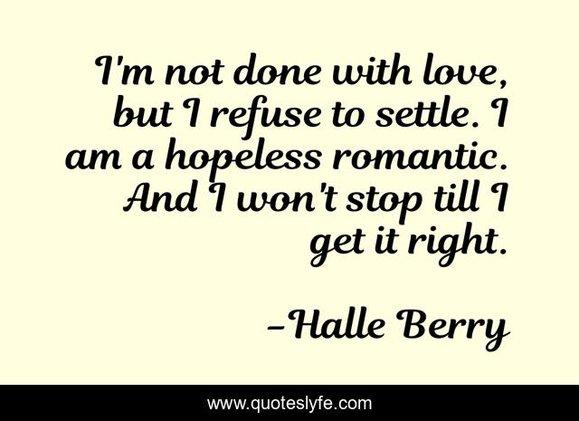 This page presents the quote "I'm not done with love, but I refuse to settle. I am a hopeless romantic. And I won't stop till I get it right.". Author of this quote is Halle Berry. This quote is about done, romantic,.