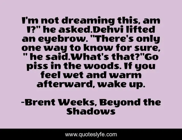 This page presents the quote "I'm not dreaming this, am I?" he asked.Dehvi lifted an eyebrow. "There's only one way to know for sure, " he said.What's that?"Go piss in the woods. If you feel wet and warm afterward, wake up.". Author of this quote is Brent Weeks, Beyond the Shadows. .