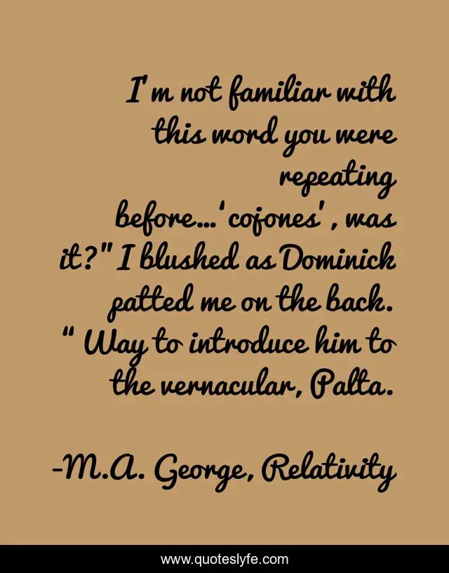 This page presents the quote "I’m not familiar with this word you were repeating before…‘cojones’, was it?”I blushed as Dominick patted me on the back. “Way to introduce him to the vernacular, Palta.". Author of this quote is M.A. George, Relativity. This quote is about cojones, humor, paranormal-romance, sarcastic-humor,.