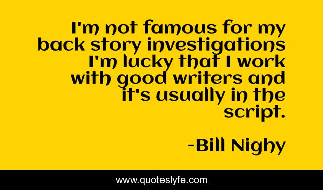 This page presents the quote "I'm not famous for my back story investigations I'm lucky that I work with good writers and it's usually in the script.". Author of this quote is Bill Nighy. This quote is about work, story, good,.