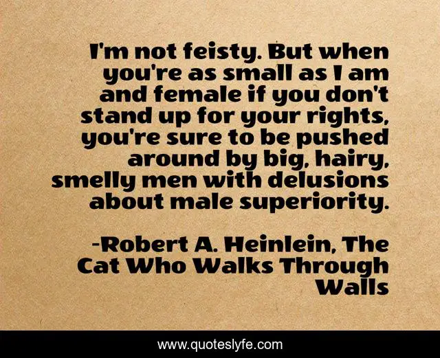 This page presents the quote "I'm not feisty. But when you're as small as I am and female if you don't stand up for your rights, you're sure to be pushed around by big, hairy, smelly men with delusions about male superiority.". Author of this quote is Robert A. Heinlein, The Cat Who Walks Through Walls. .
