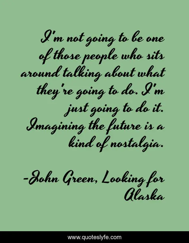 This page presents the quote "I'm not going to be one of those people who sits around talking about what they're going to do. I'm just going to do it. Imagining the future is a kind of nostalgia.". Author of this quote is John Green, Looking for Alaska. This quote is about future, nostalgia,.