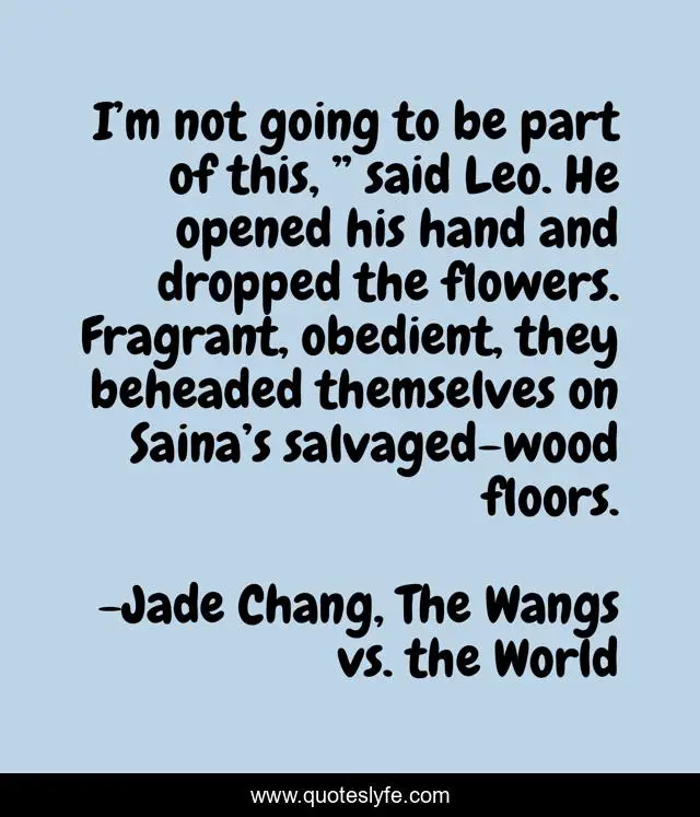 This page presents the quote "I’m not going to be part of this, ” said Leo. He opened his hand and dropped the flowers. Fragrant, obedient, they beheaded themselves on Saina’s salvaged-wood floors.". Author of this quote is Jade Chang, The Wangs vs. the World. This quote is about beheaded, flowers,.