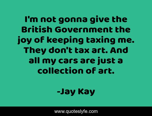This page presents the quote "I'm not gonna give the British Government the joy of keeping taxing me. They don't tax art. And all my cars are just a collection of art.". Author of this quote is Jay Kay. This quote is about me, joy, government,.