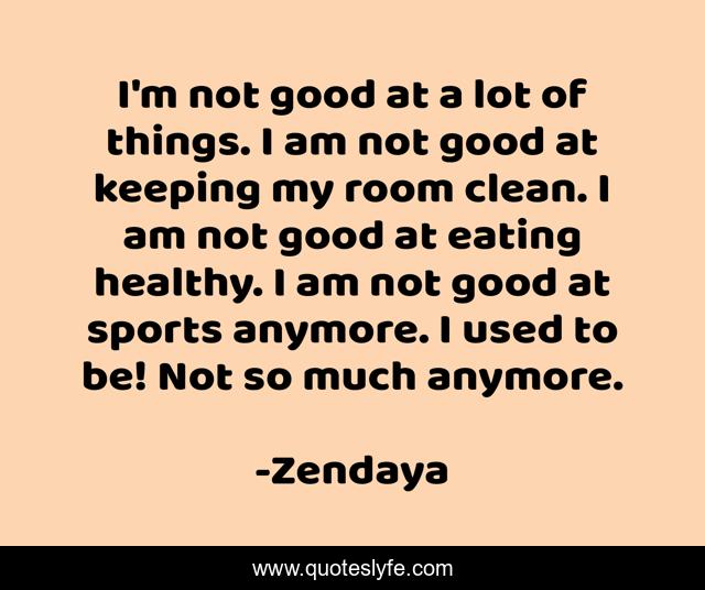 This page presents the quote "I'm not good at a lot of things. I am not good at keeping my room clean. I am not good at eating healthy. I am not good at sports anymore. I used to be! Not so much anymore.". Author of this quote is Zendaya. This quote is about healthy, good,.