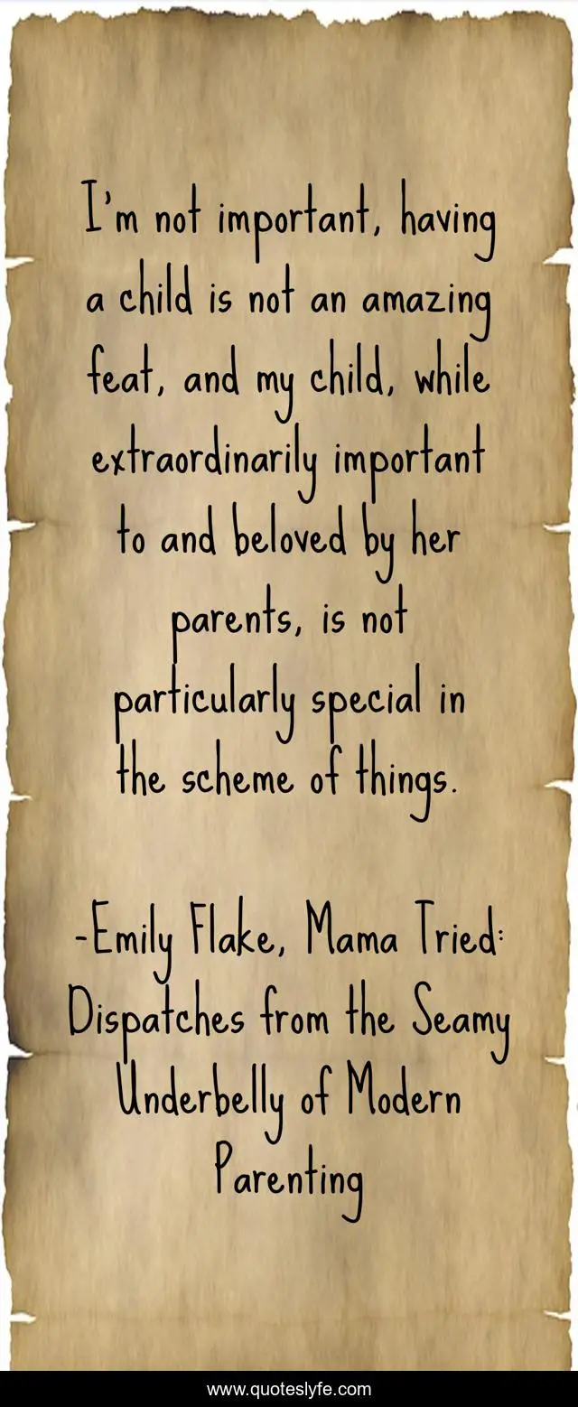 This page presents the quote "I'm not important, having a child is not an amazing feat, and my child, while extraordinarily important to and beloved by her parents, is not particularly special in the scheme of things.". Author of this quote is Emily Flake, Mama Tried: Dispatches from the Seamy Underbelly of Modern Parenting. This quote is about pregnancy, parenting,.