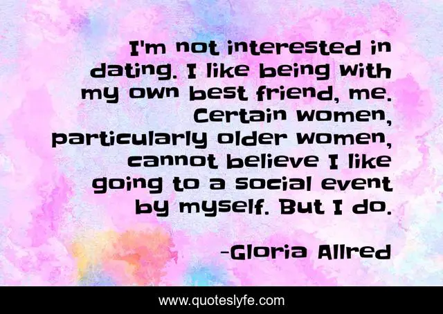 This page presents the quote "I'm not interested in dating. I like being with my own best friend, me. Certain women, particularly older women, cannot believe I like going to a social event by myself. But I do.". Author of this quote is Gloria Allred. This quote is about best friend, best, women,.