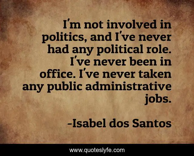 This page presents the quote "I'm not involved in politics, and I've never had any political role. I've never been in office. I've never taken any public administrative jobs.". Author of this quote is Isabel dos Santos. This quote is about political, office,.