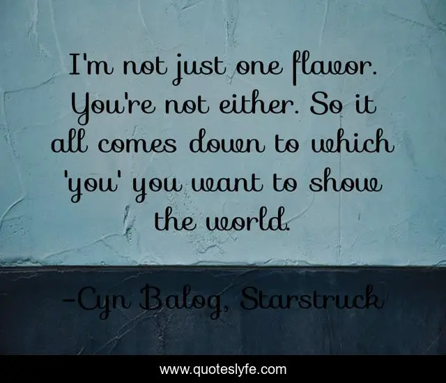 This page presents the quote "I'm not just one flavor. You're not either. So it all comes down to which 'you' you want to show the world.". Author of this quote is Cyn Balog, Starstruck. .