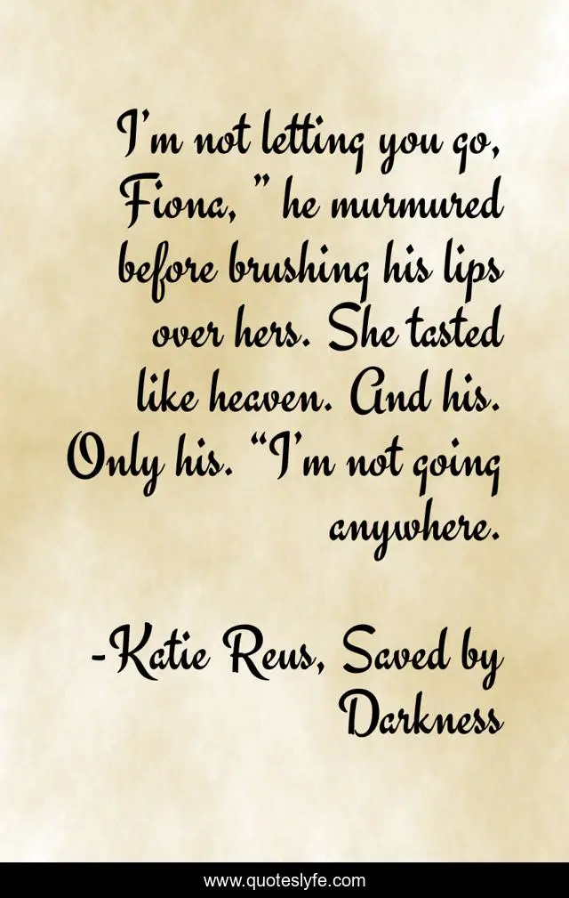 This page presents the quote "I’m not letting you go, Fiona, ” he murmured before brushing his lips over hers. She tasted like heaven. And his. Only his. “I’m not going anywhere.". Author of this quote is Katie Reus, Saved by Darkness. This quote is about wolf-shifters, shifters, vampire, demons, dragons, paranormal-urban-fantasy-romance,.