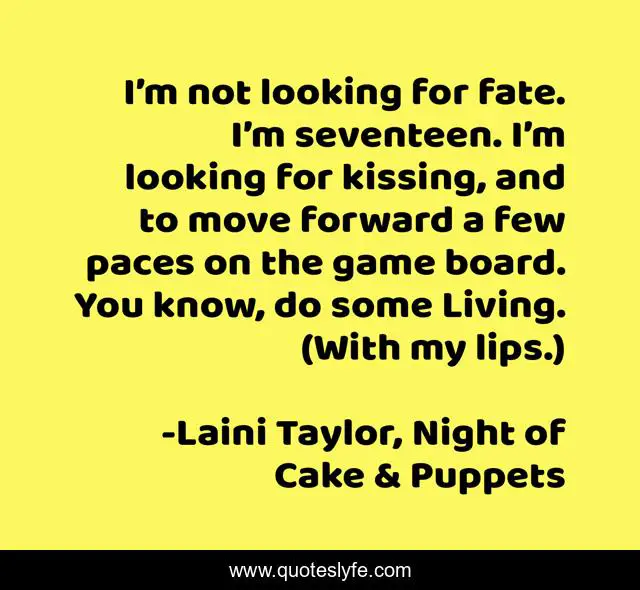 This page presents the quote "I’m not looking for fate. I’m seventeen. I’m looking for kissing, and to move forward a few paces on the game board. You know, do some Living. (With my lips.)". Author of this quote is Laini Taylor, Night of Cake & Puppets. This quote is about kissing, fate, living,.