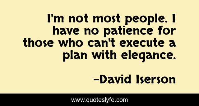 This page presents the quote "I'm not most people. I have no patience for those who can't execute a plan with elegance.". Author of this quote is David Iserson. This quote is about quotes, book, firecracker, astrid-krieger,.