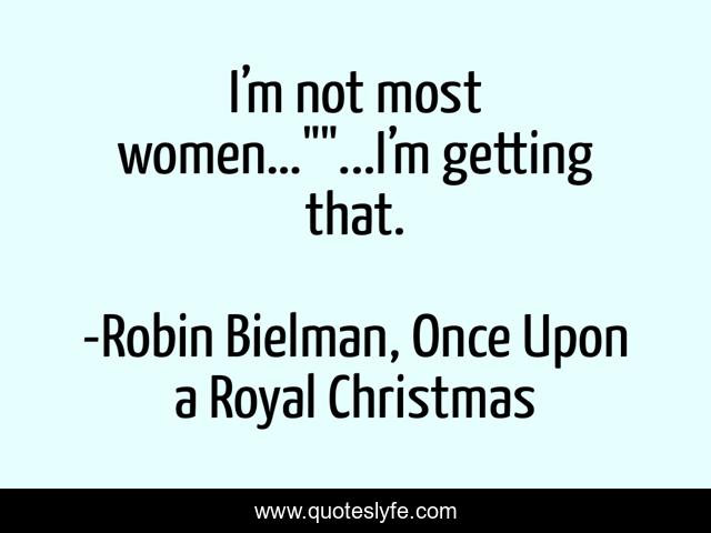 This page presents the quote "I’m not most women…""...I’m getting that.". Author of this quote is Robin Bielman, Once Upon a Royal Christmas. This quote is about holiday-romance, royal-romance, christmas-romance, contemporary-romance,.
