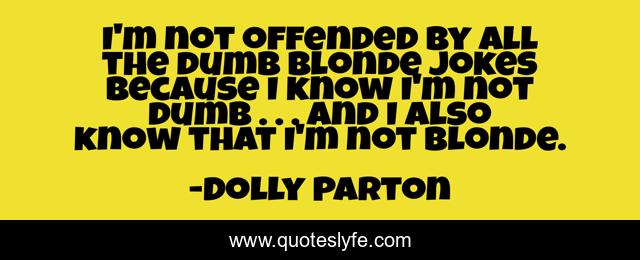 This page presents the quote "I'm not offended by all the dumb blonde jokes because I know I'm not dumb . . . and I also know that I'm not blonde.". Author of this quote is Dolly Parton. .
