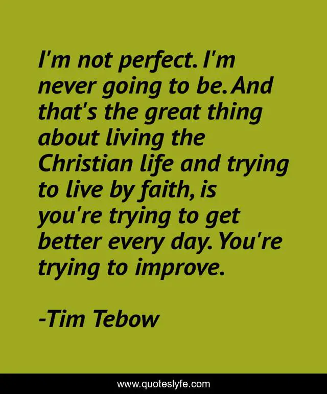 This page presents the quote "I'm not perfect. I'm never going to be. And that's the great thing about living the Christian life and trying to live by faith, is you're trying to get better every day. You're trying to improve.". Author of this quote is Tim Tebow. This quote is about faith, life, day,.
