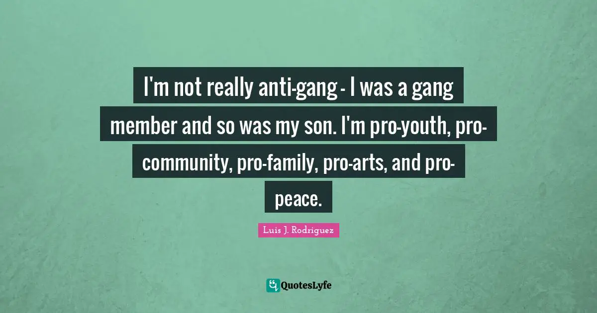 This page presents the quote "I'm not really anti-gang - I was a gang member and so was my son. I'm pro-youth, pro-community, pro-family, pro-arts, and pro-peace.". Author of this quote is Luis J. Rodriguez. This quote is about peace, gang members, family, community, youth, art, son, my son, gang,.
