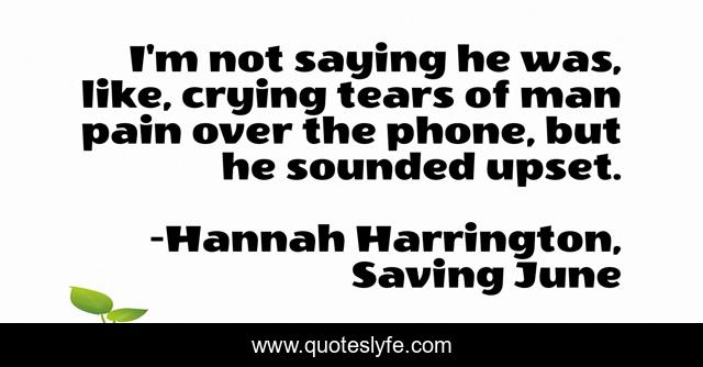 This page presents the quote "I'm not saying he was, like, crying tears of man pain over the phone, but he sounded upset.". Author of this quote is Hannah Harrington, Saving June. This quote is about funny, comedy, humor, humour,.