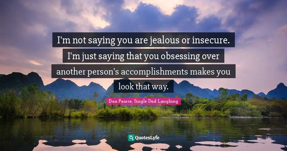 This page presents the quote "I'm not saying you are jealous or insecure. I'm just saying that you obsessing over another person's accomplishments makes you look that way.". Author of this quote is Dan Pearce, Single Dad Laughing. This quote is about insecurity, insecurities, jealousy, accomplishments, jealous, obsession,.