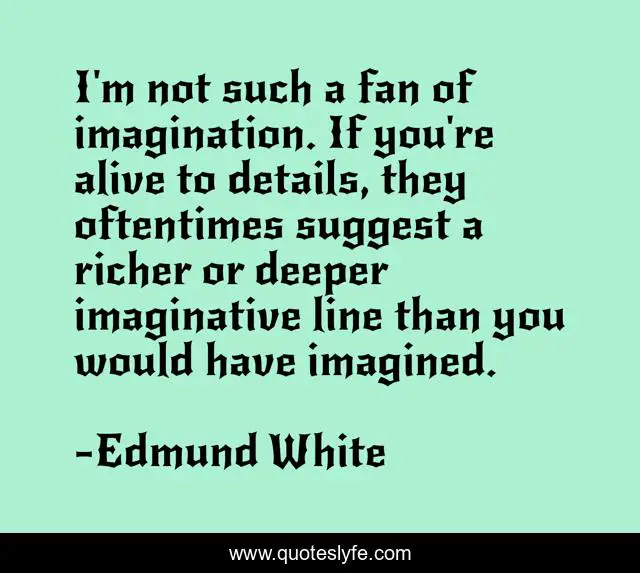This page presents the quote "I'm not such a fan of imagination. If you're alive to details, they oftentimes suggest a richer or deeper imaginative line than you would have imagined.". Author of this quote is Edmund White. This quote is about line, details,.