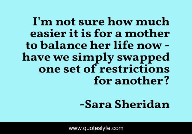 This page presents the quote "I'm not sure how much easier it is for a mother to balance her life now - have we simply swapped one set of restrictions for another?". Author of this quote is Sara Sheridan. This quote is about restrictions, life, mothers, time, balance, feminism,.