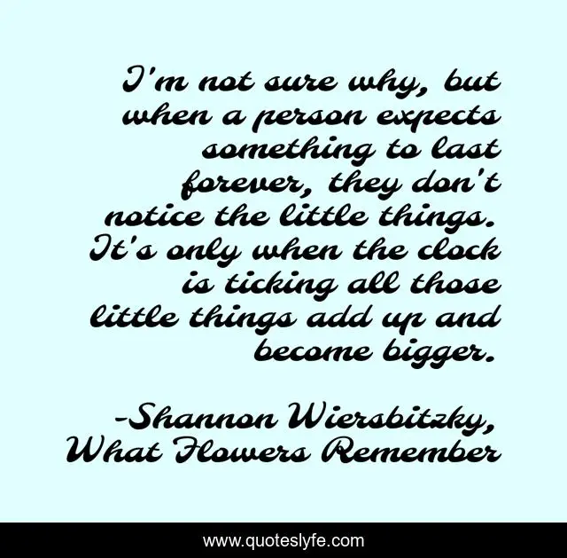 This page presents the quote "I'm not sure why, but when a person expects something to last forever, they don't notice the little things. It's only when the clock is ticking all those little things add up and become bigger.". Author of this quote is Shannon Wiersbitzky, What Flowers Remember. This quote is about forever, life, small-things, details, ticking, big-things, little-things,.
