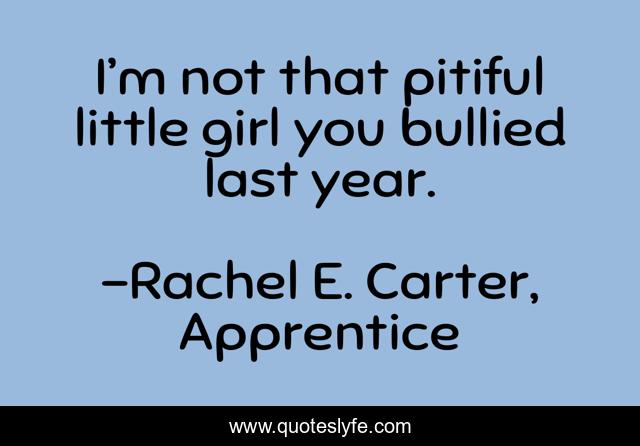 This page presents the quote "I’m not that pitiful little girl you bullied last year.". Author of this quote is Rachel E. Carter, Apprentice. This quote is about magic, ryiah, darren, romance, fantasy, young-adult, prince, priscilla,.