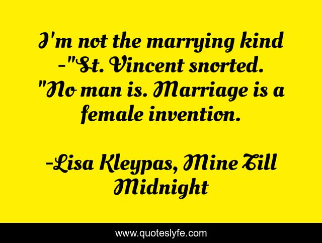 This page presents the quote "I'm not the marrying kind -"St. Vincent snorted. "No man is. Marriage is a female invention.". Author of this quote is Lisa Kleypas, Mine Till Midnight. This quote is about marriage, female,.