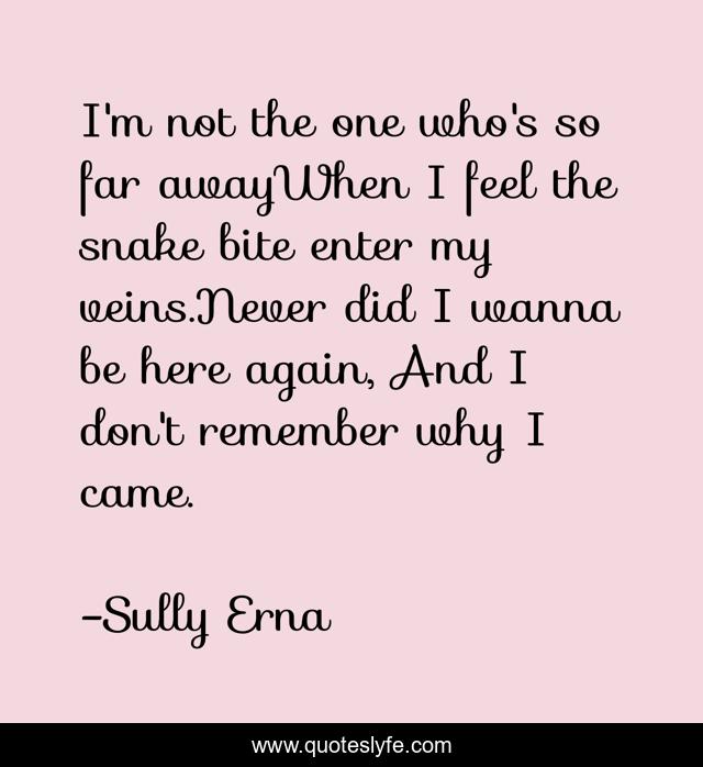 This page presents the quote "I'm not the one who's so far awayWhen I feel the snake bite enter my veins.Never did I wanna be here again, And I don't remember why I came.". Author of this quote is Sully Erna. This quote is about sully, witchcraft, song, metal, erna, band, music, snake, voodoo,.