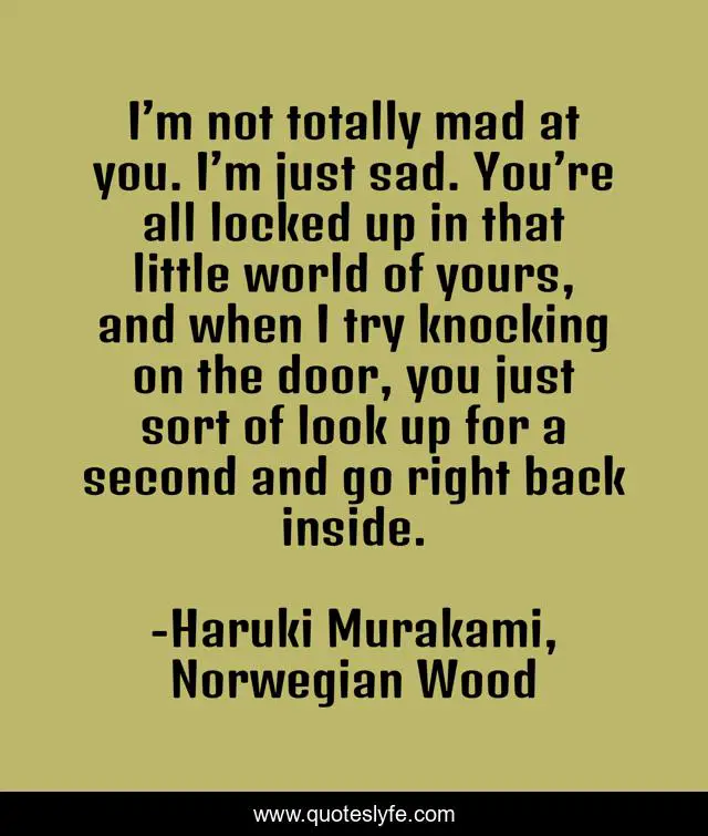 This page presents the quote "I’m not totally mad at you. I’m just sad. You’re all locked up in that little world of yours, and when I try knocking on the door, you just sort of look up for a second and go right back inside.". Author of this quote is Haruki Murakami, Norwegian Wood. This quote is about disappointed, help, own-world,.