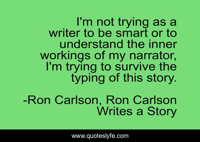 This page presents the quote "I'm not trying as a writer to be smart or to understand the inner workings of my narrator, I'm trying to survive the typing of this story.". Author of this quote is Ron Carlson, Ron Carlson Writes a Story. .