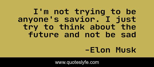 This page presents the quote "I'm not trying to be anyone's savior. I just try to think about the future and not be sad". Author of this quote is Elon Musk. This quote is about science, ted, inspirational, enthusiasm,.