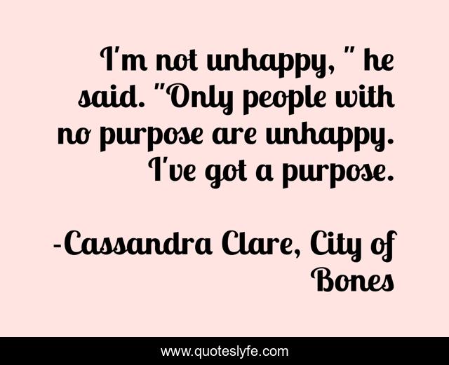 This page presents the quote "I'm not unhappy, " he said. "Only people with no purpose are unhappy. I've got a purpose.". Author of this quote is Cassandra Clare, City of Bones. This quote is about jace-wayland, cassandra-clare, purpose, city-of-bones, unhappiness,.