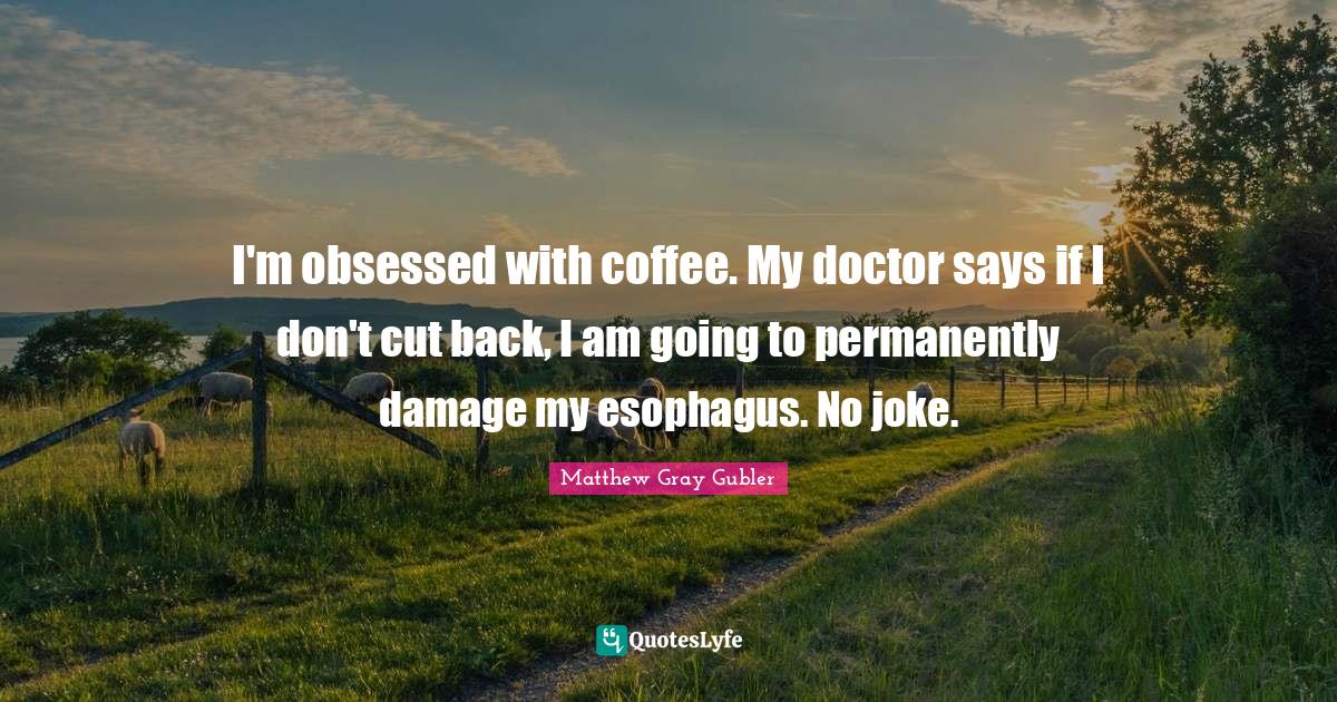 This page presents the quote "I'm obsessed with coffee. My doctor says if I don't cut back, I am going to permanently damage my esophagus. No joke.". Author of this quote is Matthew Gray Gubler. This quote is about doctors, obsessed, coffee, cutting, damage,.