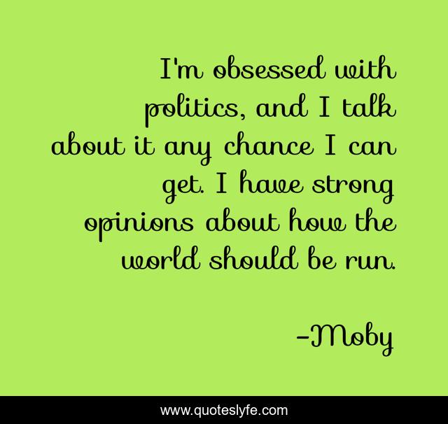 This page presents the quote "I'm obsessed with politics, and I talk about it any chance I can get. I have strong opinions about how the world should be run.". Author of this quote is Moby. This quote is about politics, strong, world,.