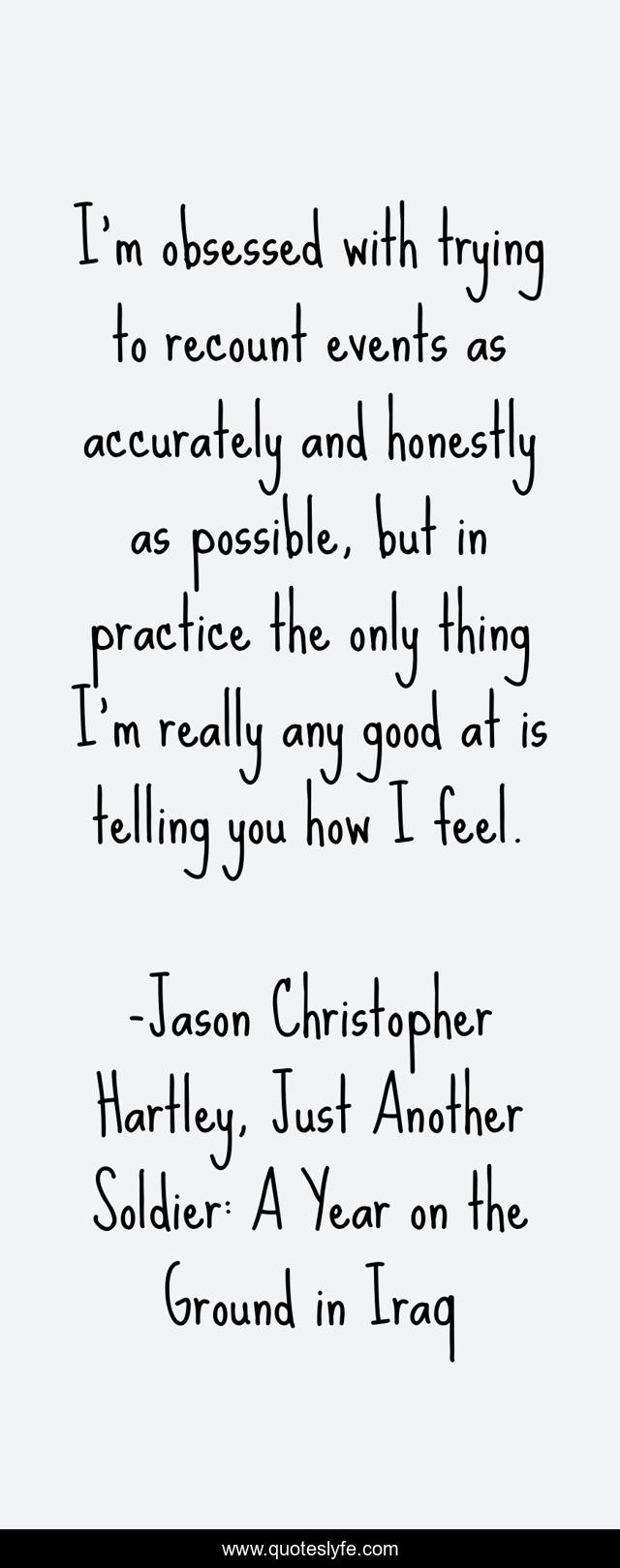 This page presents the quote "I'm obsessed with trying to recount events as accurately and honestly as possible, but in practice the only thing I'm really any good at is telling you how I feel.". Author of this quote is Jason Christopher Hartley, Just Another Soldier: A Year on the Ground in Iraq. This quote is about life, emotions, writing, soldier, deployment, iraq,.