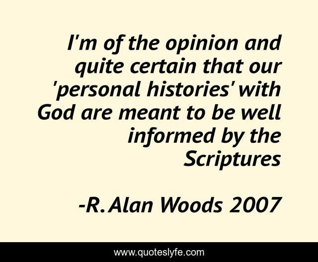 This page presents the quote "I'm of the opinion and quite certain that our 'personal histories' with God are meant to be well informed by the Scriptures". Author of this quote is R. Alan Woods 2007. This quote is about discipleship, bible-interpretation, theology,.